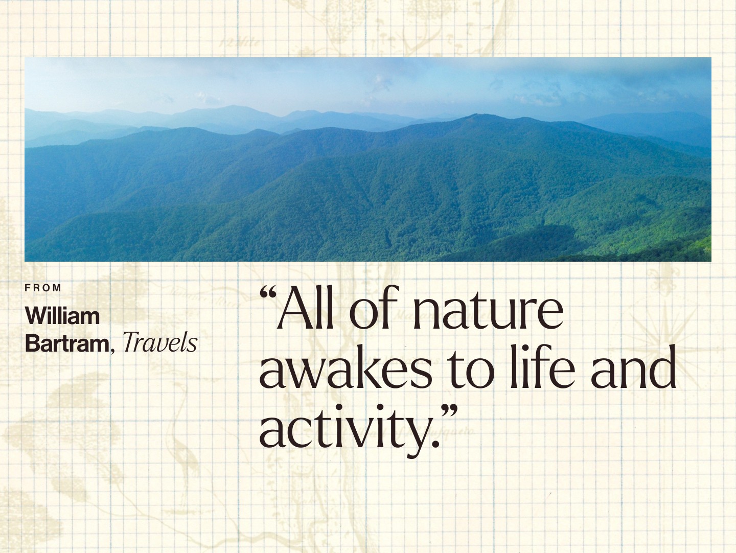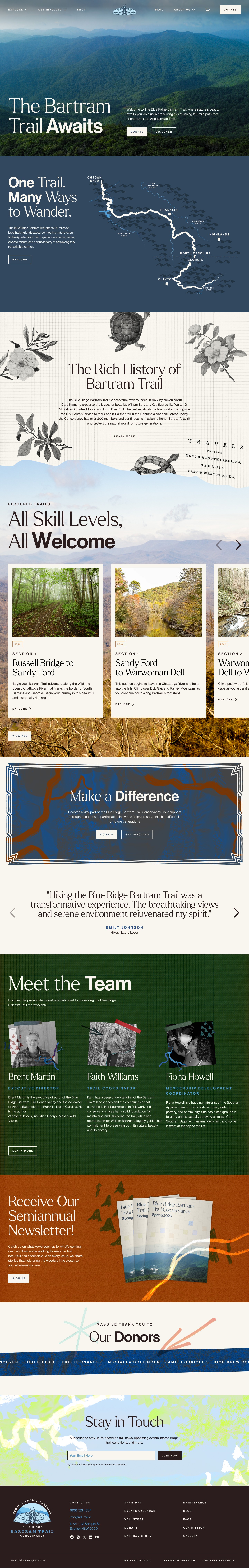 The Blue Ridge Bartram Trail Conservancy is located in the Appalachian Mountains. In preparation of their 250 year celebration they requested a brand facelift and new website. William Bartram, the trail's namesake, well documented the area on his travels down the range through journal entries and illustrations. We were tasked with highlighting the picturesque trail, its history, and community opportunities.